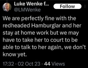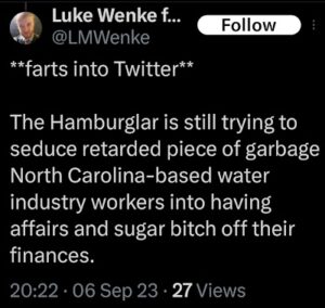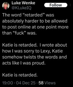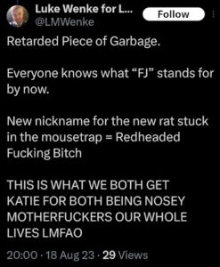 Note: In his recent Tweets, Luke Wenke used “Hamas” as a code word for myself (Katie) and two other victims (the Minnesota attorney and his romantic obsession, Ryan)