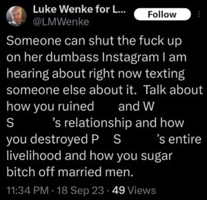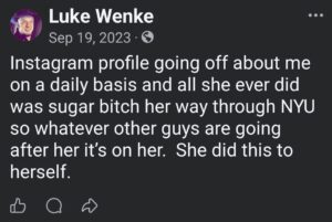 The following screenshot reflects Luke Wenke’s apparent belief that his victims should suffer in silence and that he deserves carte blanche when it comes to his internet behavior. For context, Wenke’s mother had recently gained access to my Instagram account, where I had mentioned being stalked. In addition to trying to control my speech on a PRIVATE social media account while routinely slandering me in VERY public posts, Wenke falsely accused me of destroying one ex-boyfriend’s marriage and ruining another’s life.
