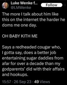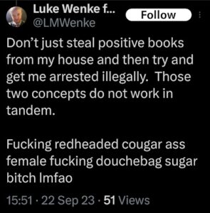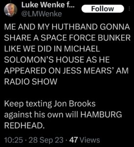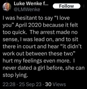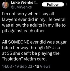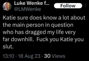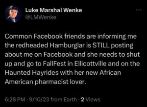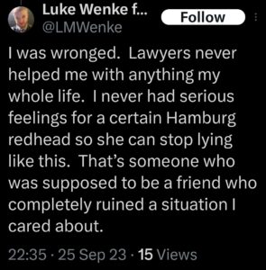 The next post is particularly disturbing because it’s about my ex-husband, whom I’ve been divorced from since 2012 (yes, 14 years ago). There’s no bad blood between us, as far as I know, because we haven’t spoken in well over a decade. The fact that Luke Wenke thinks about my past partners more often than I do reflects the troubling extent of his irrational obsession with me.