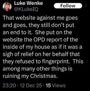 NOTE: In the weeks leading up to his most recent arrest on 12/17/2025, Luke Wenke used “Hamas” as a code word for several of his victims including myself, Ryan (his romantic obsession), and the Minnesota attorney he served prison time for cyberstalking.