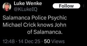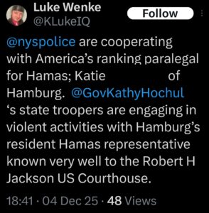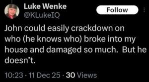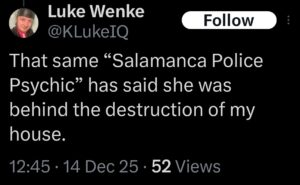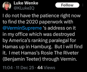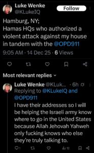 NOTE: In the weeks leading up to his most recent arrest on 12/17/2025, Luke Wenke used “Hamas” as a code word for several of his victims including myself, Ryan (his romantic obsession), and the Minnesota attorney he served prison time for cyberstalking. I believe that Wenke’s use of the term “Israeli Army” is a reference to a theoretical paid assassin (i.e. a hitman).