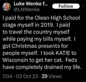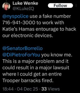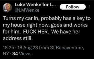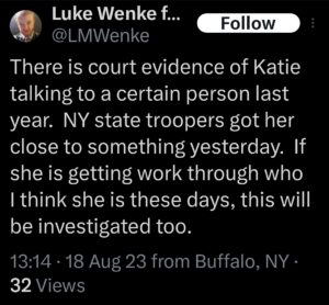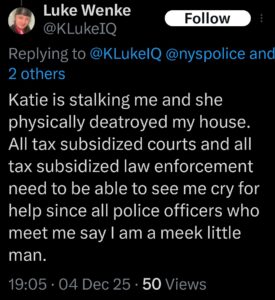 Categories: Luke Wenke, False Allegations: burglary/home invasion, conspiracy/collusion, drug crimes, drug use, hacking, HIPAA violations, trespassing, vandalism/property damage; Obsessions: Carl Paladino obsession, Katie Obsession, Ryan/Benjamin obsession; screenshots, social media posts, Threats: death threats, doxxing, lying to police, misuse of personal information, physical harm, threats to sue